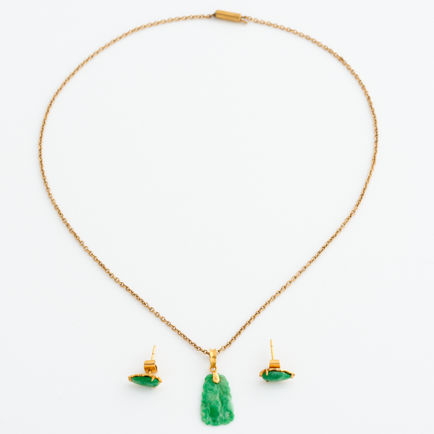 A SUITE OF JADE JEWELLERY INCLUDING A NECKLACE IN GOLD PLATE, 360MM, AND A PAIR OF EARRINGS IN 20CT GOLD, TO POST AND BUTTERFLY FITTINGS, TOTAL WEIGHT 3.65GMS