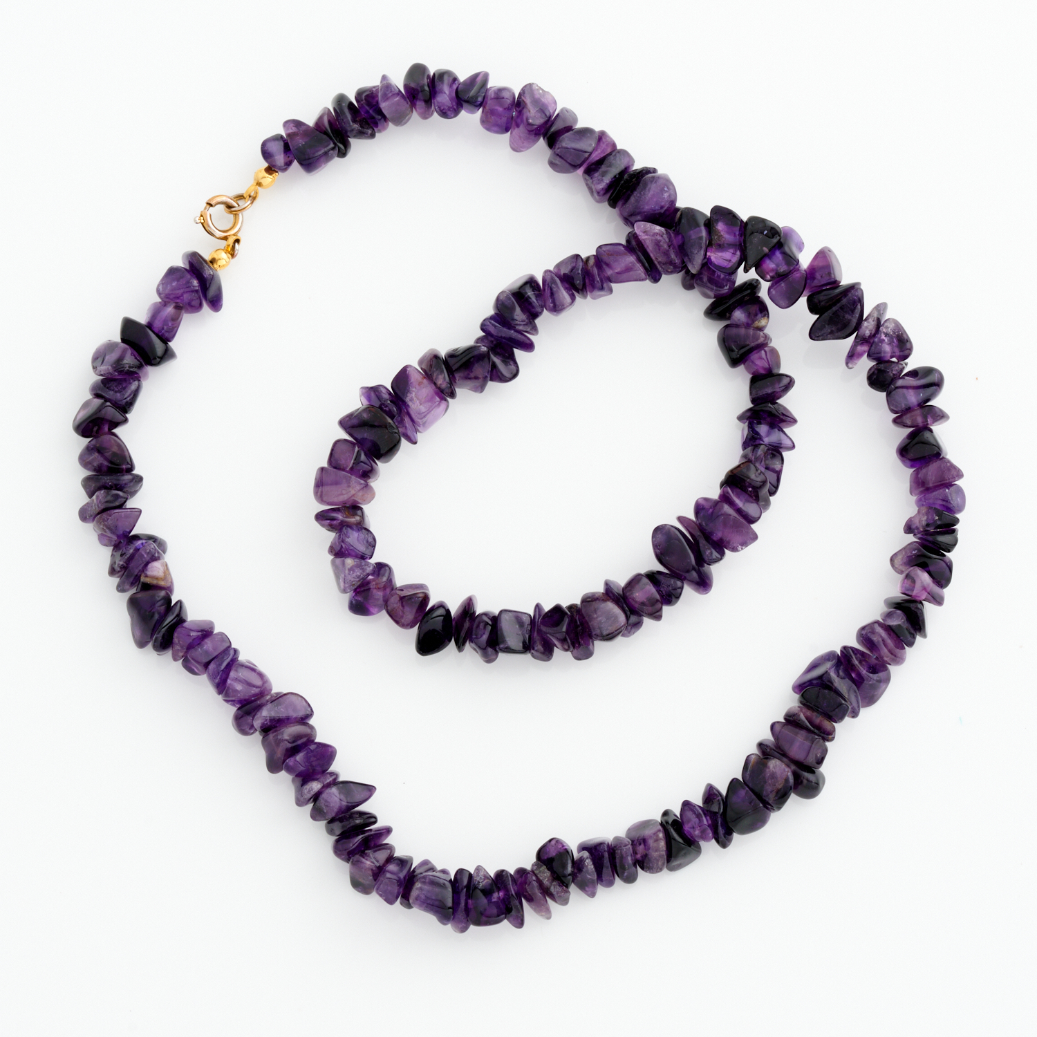 A STRAND OF TUMBLED AMETHYST BEADS, TO A CLASP IN GOLD PLATE, 520MM