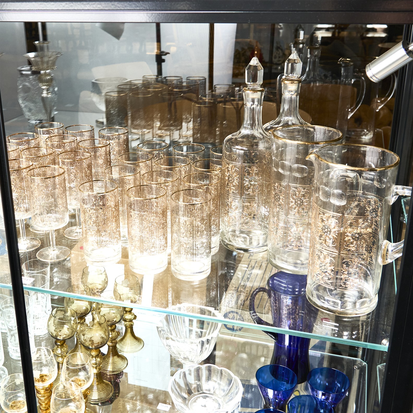A SUITE OF 24 MID-CENTURY GLASSES IN TWO SIZES WITH TWO MATCHING DECANTERS AND TWO JUGS H.32CM (TALLEST)