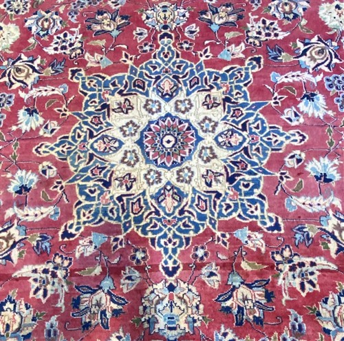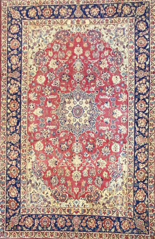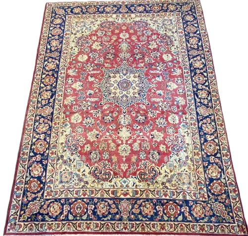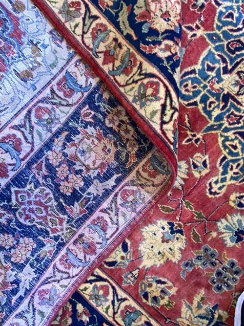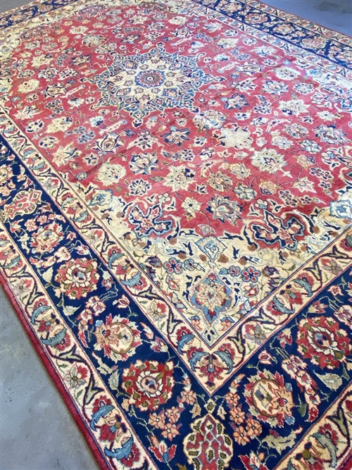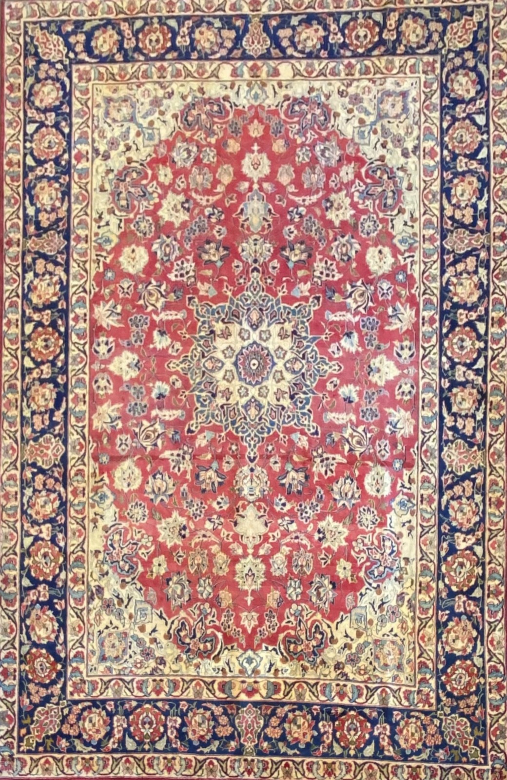 WOOL PILE & ALL VEGETABLE DYES WITH NATURAL COLOUR VARIATION. HAND-KNOTTED CITY WEAVE WITH CLASSIC DESIGN OF FLORAL MEDALLION & QUARTERED CORNER MEDALLIONS IN A VERMILLION RED FIELD OF SHAH ABBASSI PALMETTES, SAZ LEAVES & FLORAL MOTIFS. INDIGO-TONED BORDER OF ALTERNATING PALMETTES & FLORAL SPRAYS.