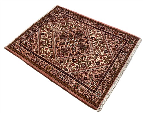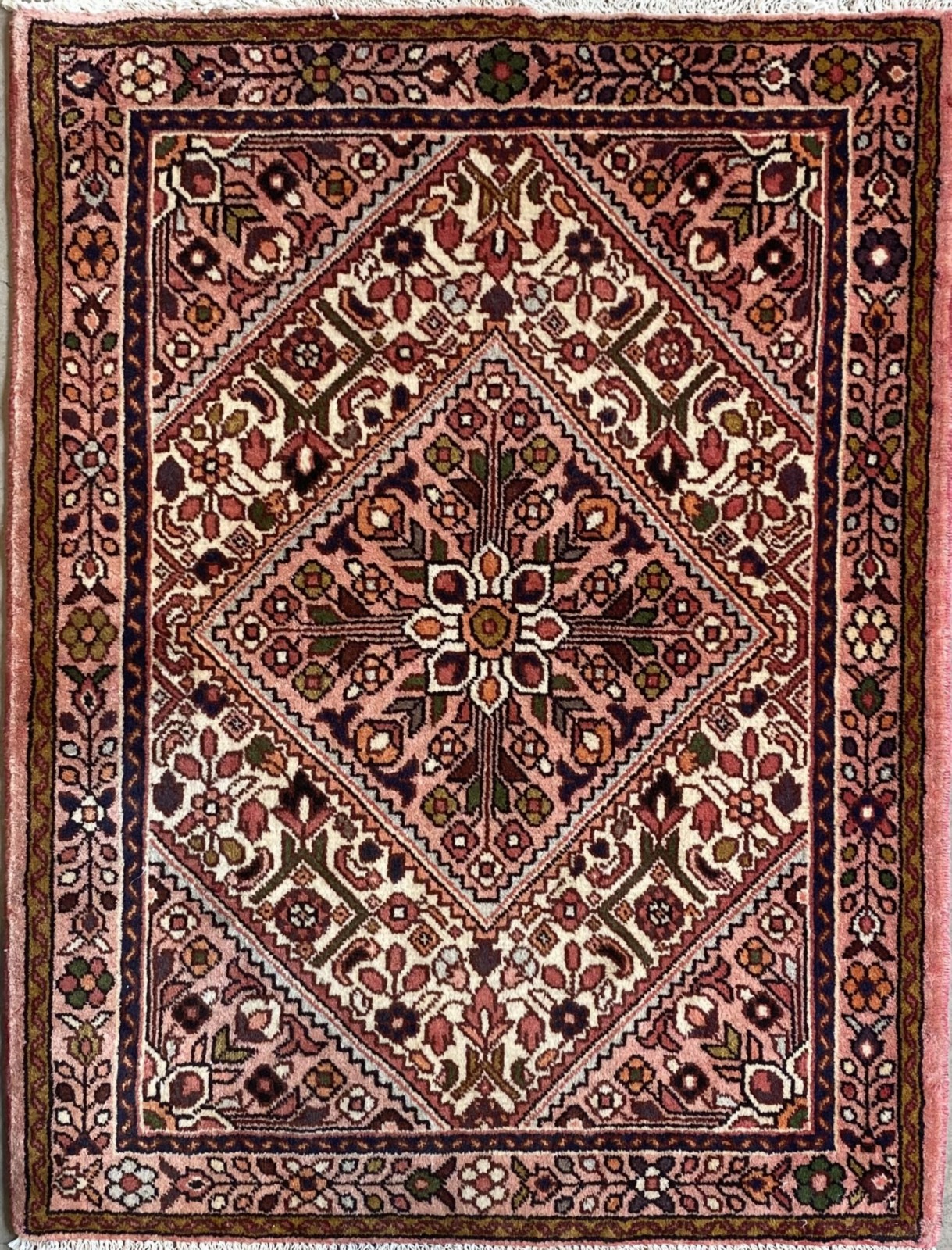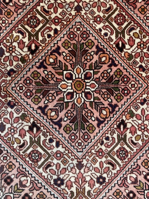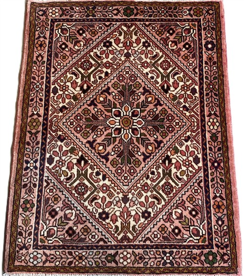 DENSE WOOL PILE. VILLAGE WEAVE FROM THE HAMADAN REGION WITH DESIGN OF A DIAMOND-SHAPED MEDALLION CONTAINING A FLORAL SPRAY IN A FIELD OF HERATI MAHI PATTERNS. FLORAL-PATTERNED BORDER.