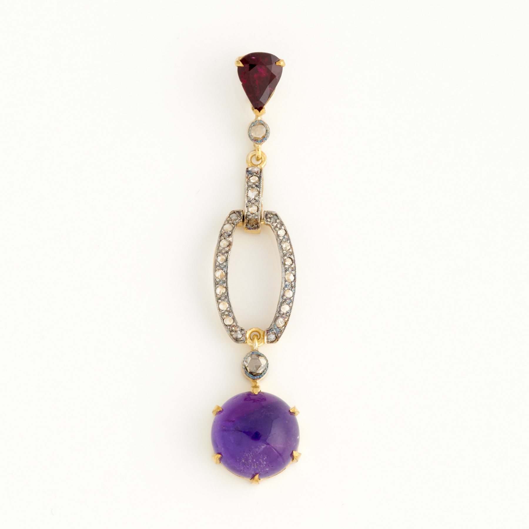 A RHODOLITE GARNET, AMETHYST AND DIAMOND PENDANT IN 9CT GOLD, 47MM, 2.99GMS