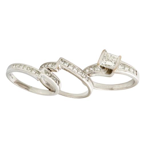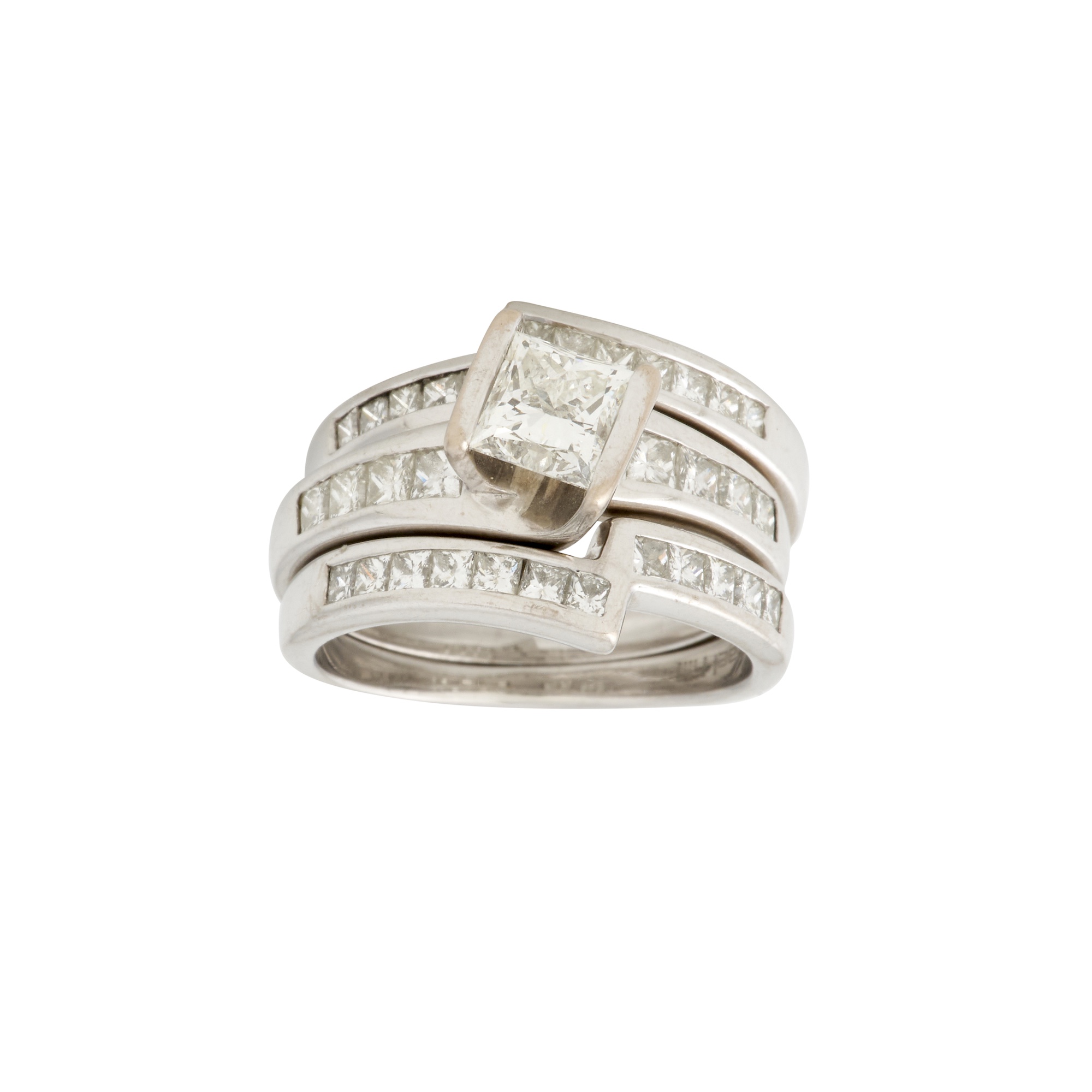 Centring a tension-set princess-cut diamond weighing 1.00 carat, to shoulders detailed with princess-cut diamonds together weighing approximately 1.50 carats, accompanied by two fitted bands detailed with further princess-cut diamonds together weighing approximately 0.80 carats, size N, gross weight approximately 12.2 grams.
