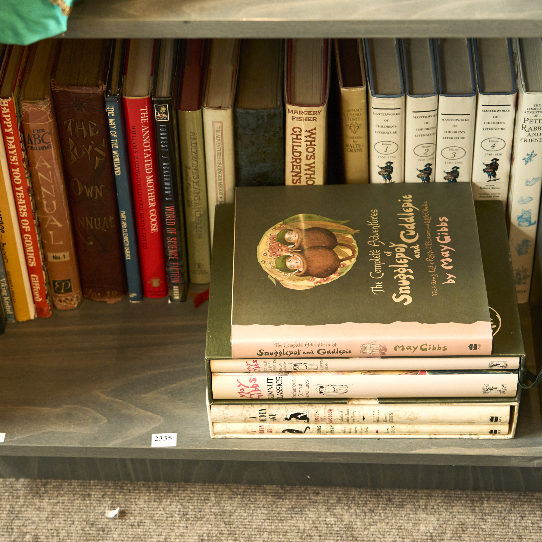 A SHELF OF CHILDREN'S BOOKS INCLUDING SNUGGLEPOT AND CUDDLEPIE, THE COMPLETE ADVENTURES OF PETER RABBIT AND THE ANNOTATED MOTHER GOOSE