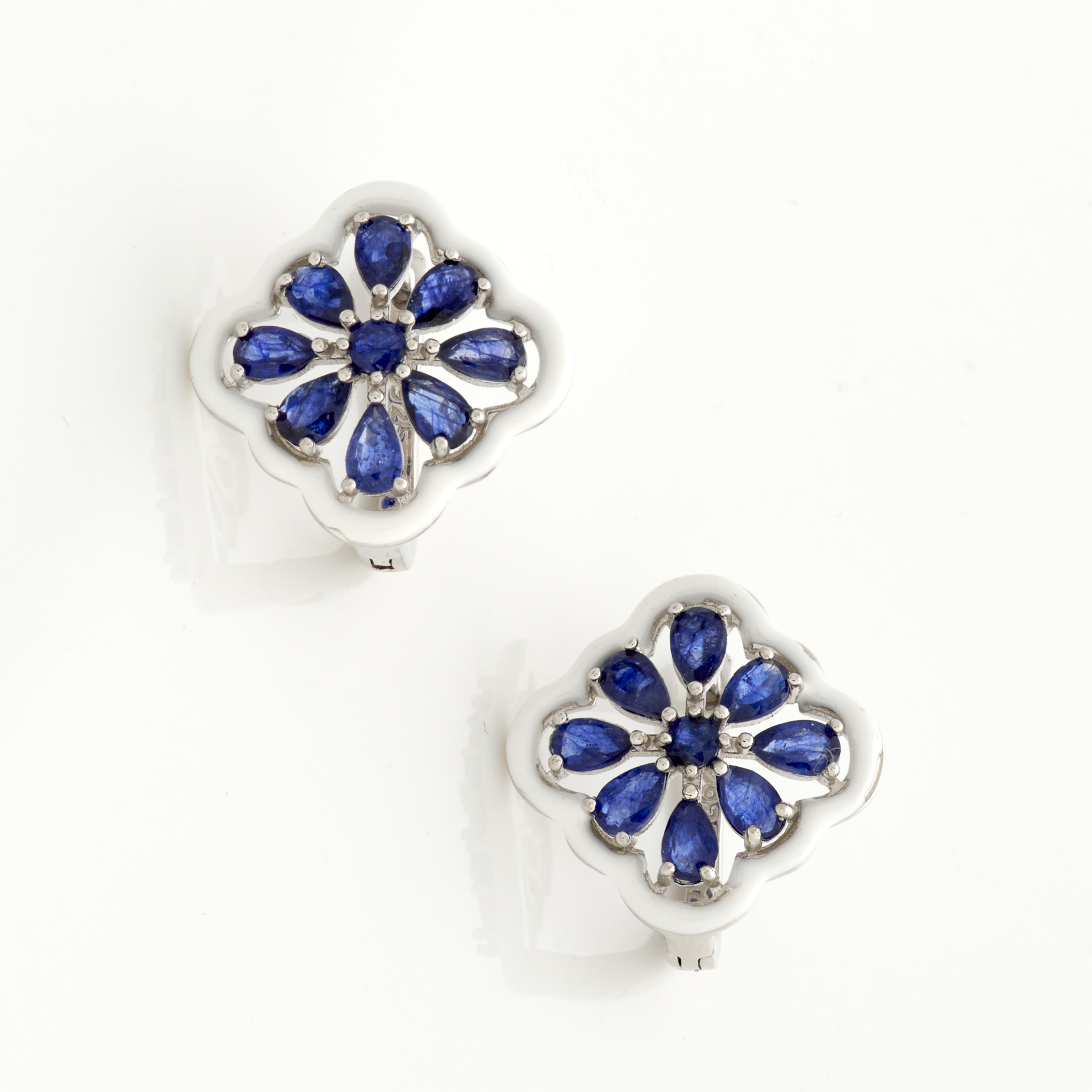 A PAIR OF SAPPHIRE AND ENAMEL EARRINGS IN STERLING SILVER, TO POST AND CLIP FITTINGS, 6.53GMS