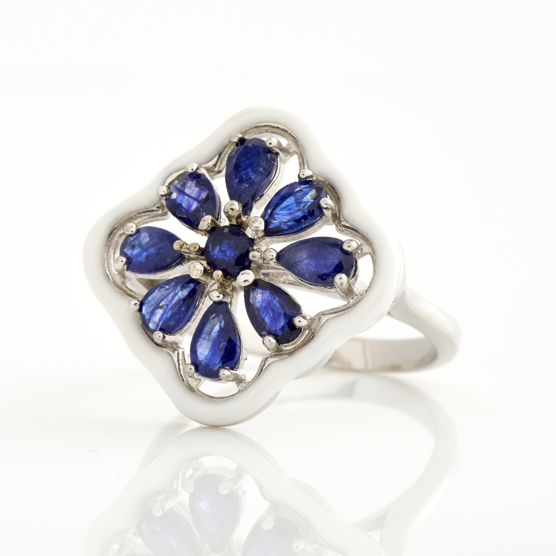 A SAPPHIRE AND ENAMEL RING IN STERLING SILVER, SIZE N1/2, 4.11GMS