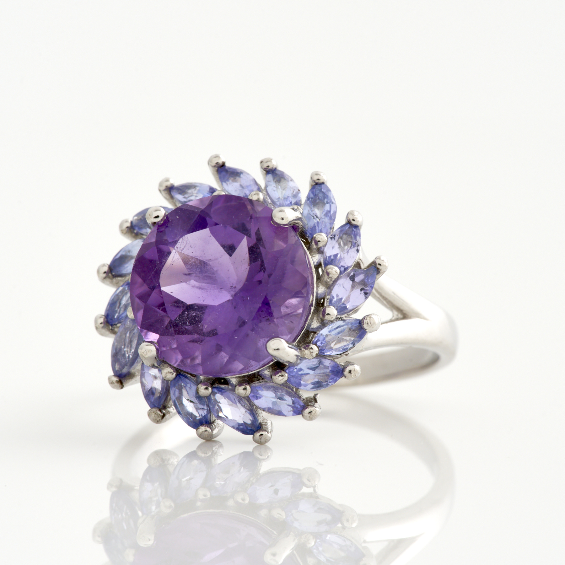 AN AMETHYST AND TANZANITE RING IN STERLING SILVER, SIZE R 1/2, 5.15GMS