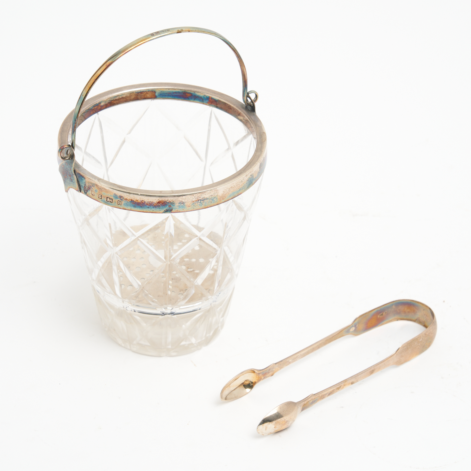 A STERLING SILVER MOUNTED CRYSTAL ICE BUCKET, J SHERWOOD & SONS, BIRMINGHAM, 1900, TOGETHER WITH A PAIR OF GEORGE IV STERLING SILVER TONGS, MAKERS MARK RUBBED, LONDON, 1829 H.14CM (TALLEST)