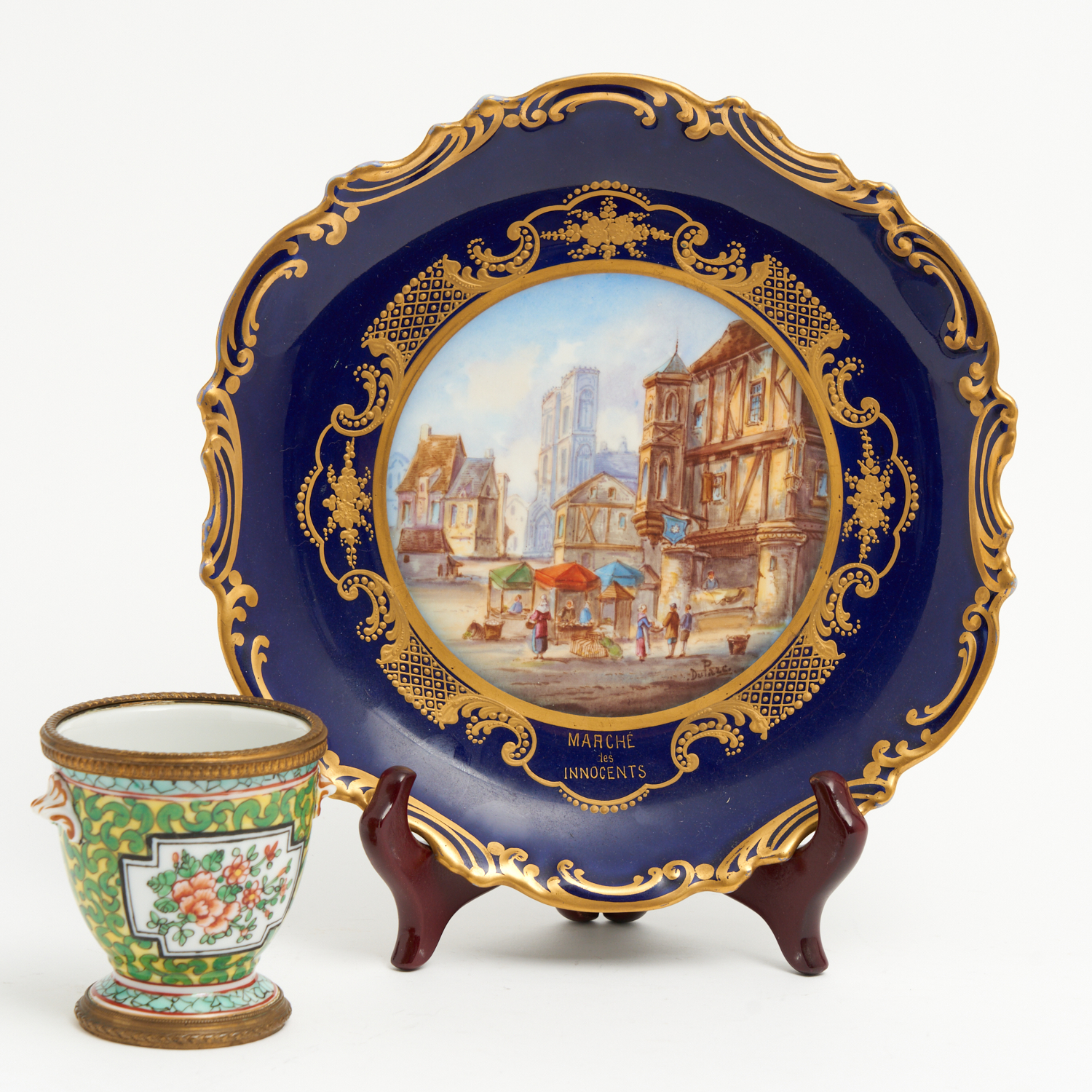 A SEVRES COBALT BLUE "MARCHE DES INNOCENTS" CABINET PLATE TOGETHER WITH A LIMOGES POT DIA.26.5CM (LARGEST)