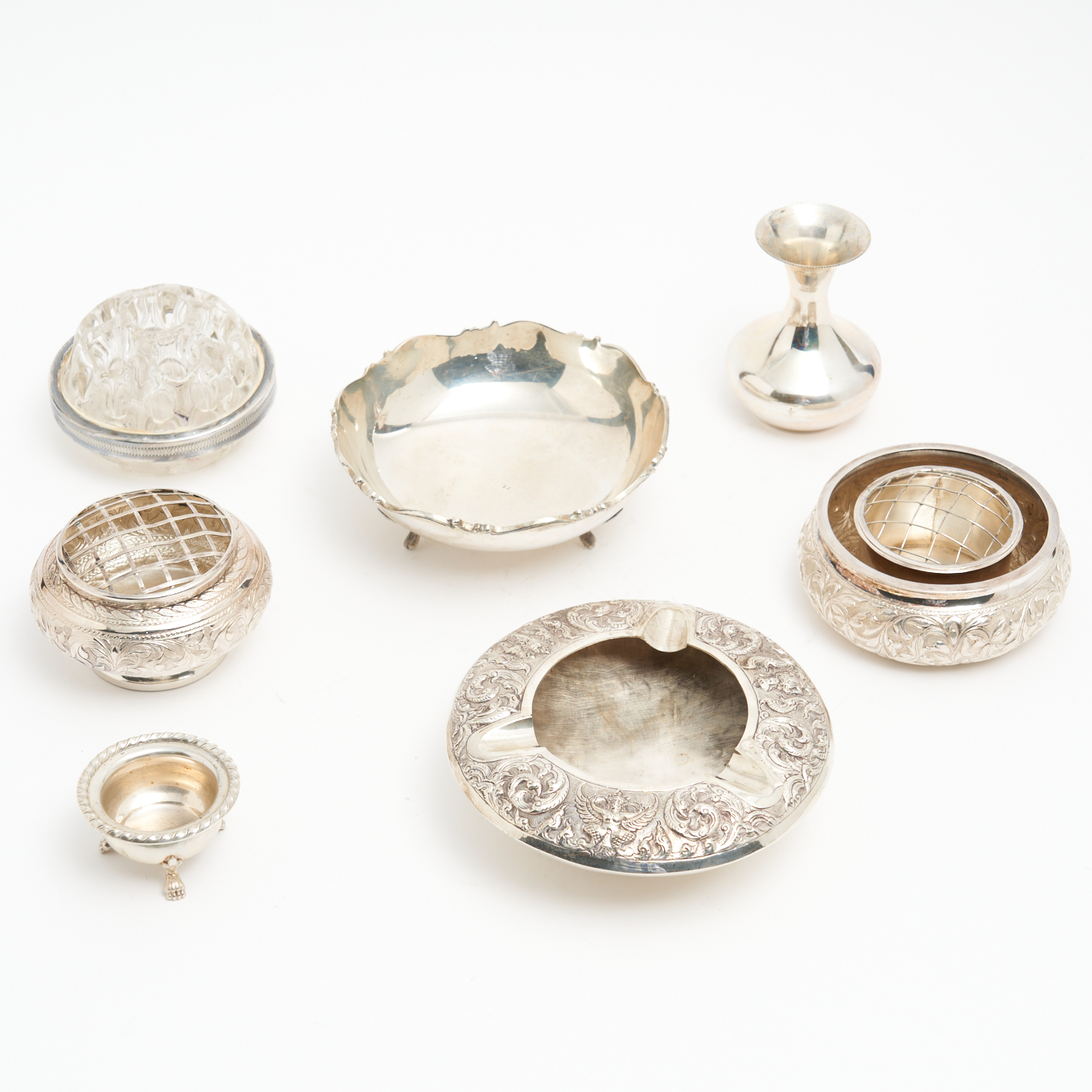 A GROUP OF SILVER ITEMS INCLUDING ASHTRAY, VASE, THREE ROSE BOWLS AND A SALT CELLAR, 800 AND 900 GRADE SILVER DUA.15CM (LARGEST)