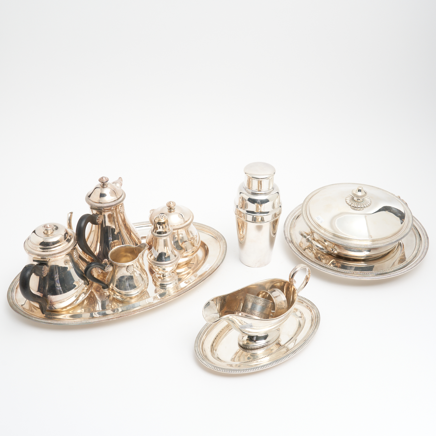 AN ASSEMBLED FRENCH SILVER PLATE TEA AND COFFEE SERVICE WITH MATCHED SUGAR SHAKER, SOUP TUREEN, AND UNDER PLATES TOGETHER WITH A COCKTAIL SHAKER, AND SERVIETEE RINGS H.21.5CM (TALLEST)