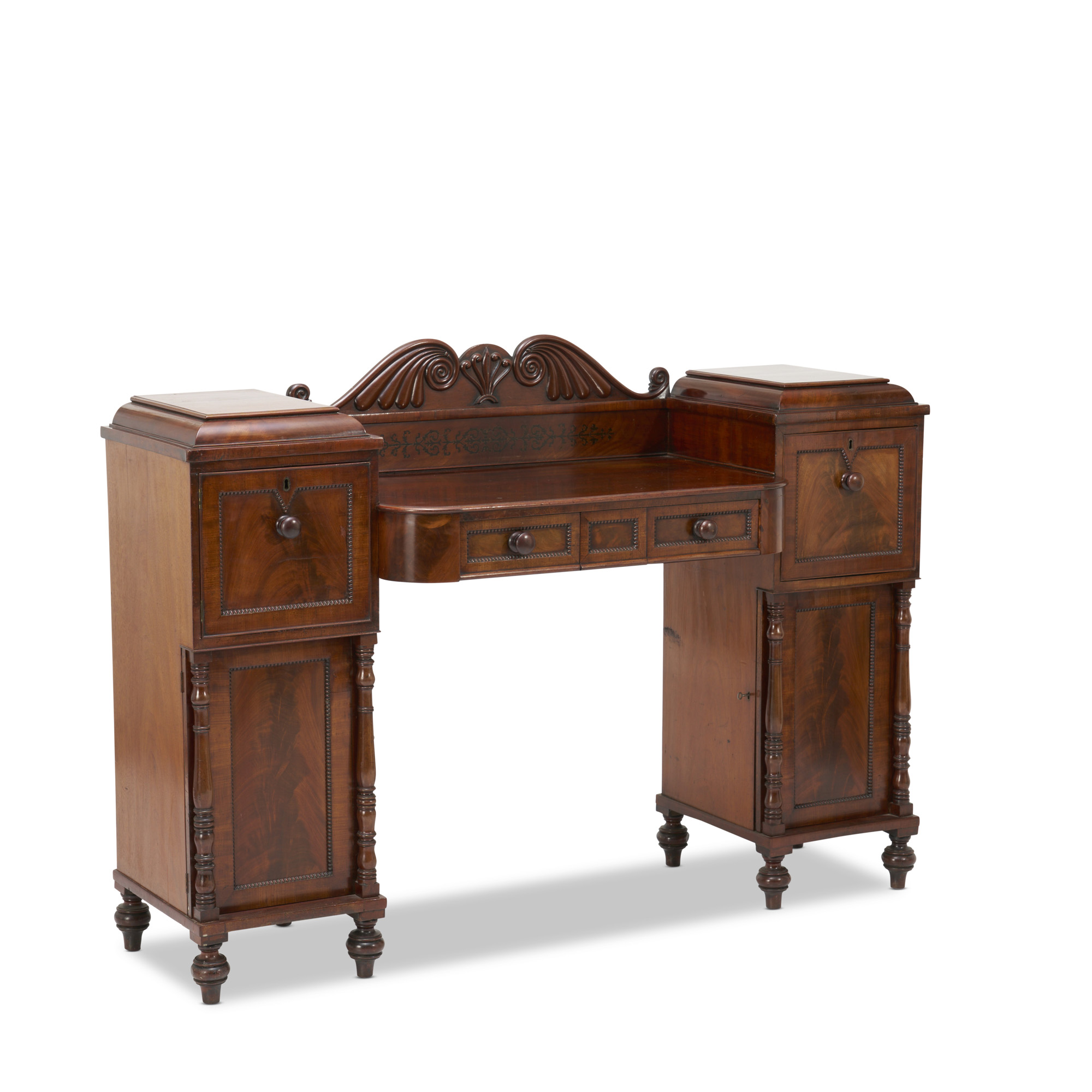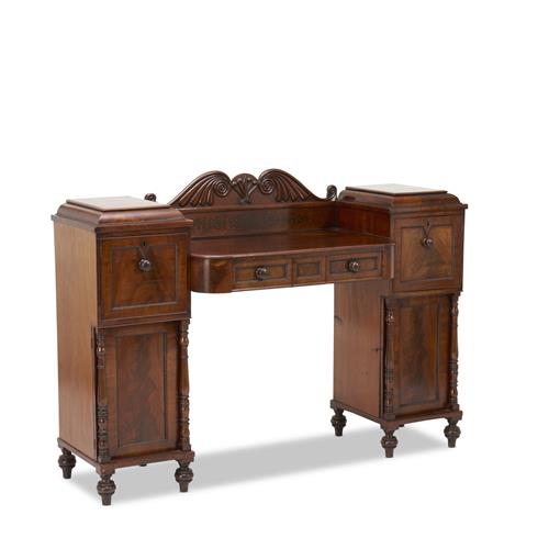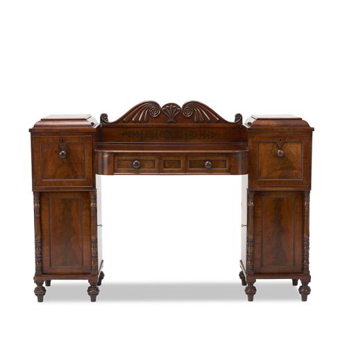 The projecting centre of the top with a low shaped back carved with scrolls centred on an anthemion above two frieze drawers between a pair of pedestals with cupboards, the right-hand pedestal with a cellarette drawer above a cupboard, the lower cupboard doors flanked by slender turned columns, on turned feet, the drawer fronts and doors panelled with gadrooned edges