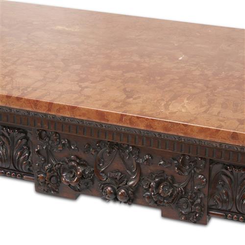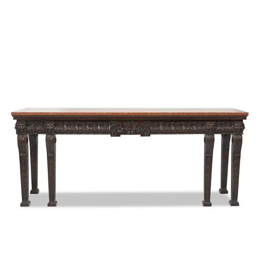 Rectangular, the thick rosso Verona marble slab top above the frieze with two large drawers, raised on tapering square supports, the frieze finely carved with a floral tablet to the centre and lion masks above the supports, otherwise with repeating acanthus sprays, the supports with acanthus scrolls above panels carved with foliate pendants