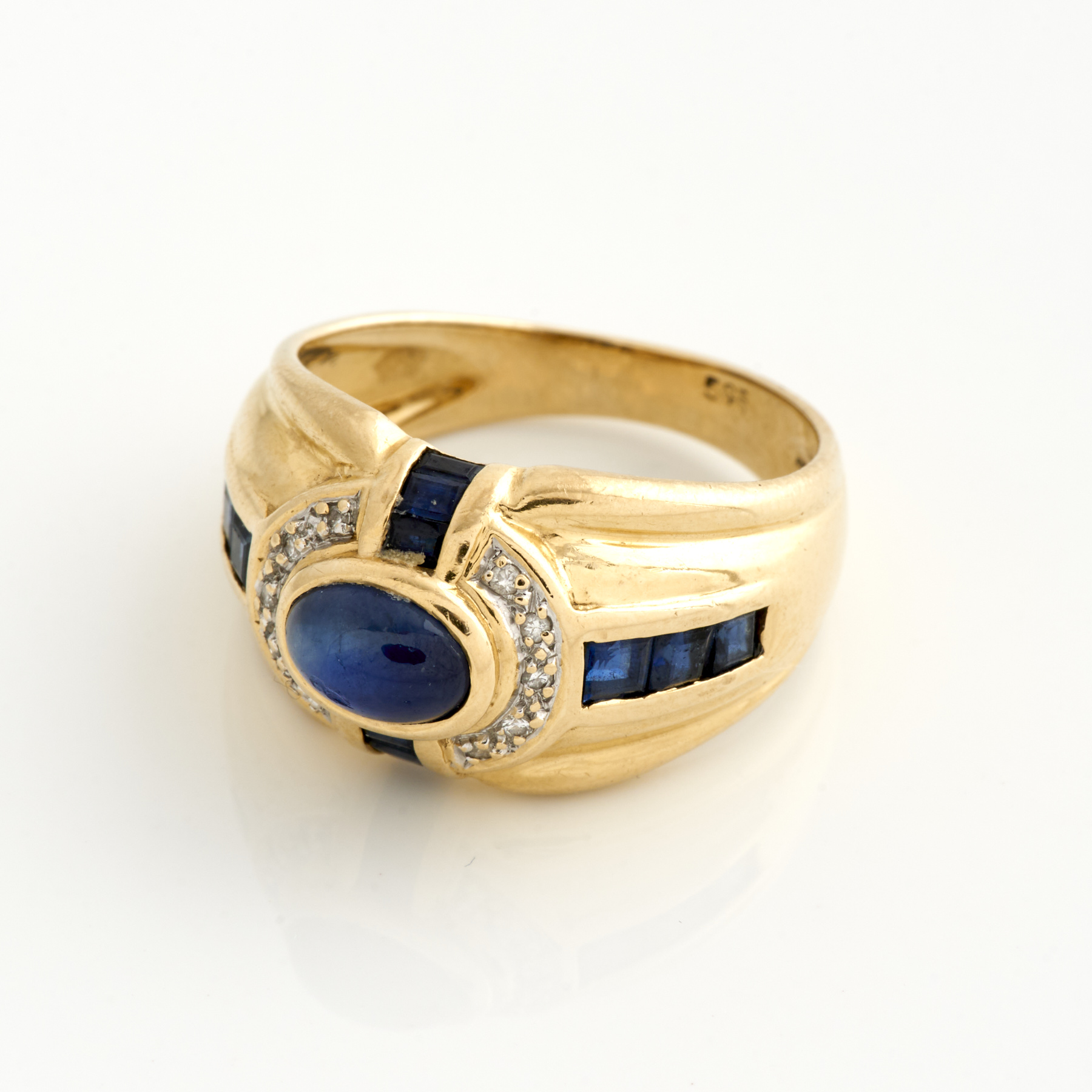 A SAPPHIRE AND DIAMOND RING IN 14CT YELLOW GOLD, THE DIAMOND TOTALLING APPROXIMATELY 0.05CT, SIZE N, 5.77GMS, ACCOMPANIED BY A VALUATION