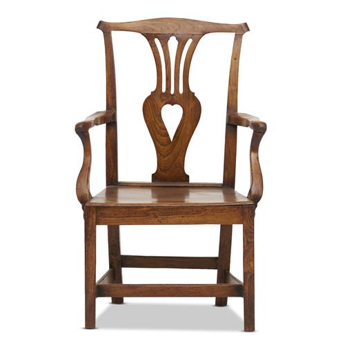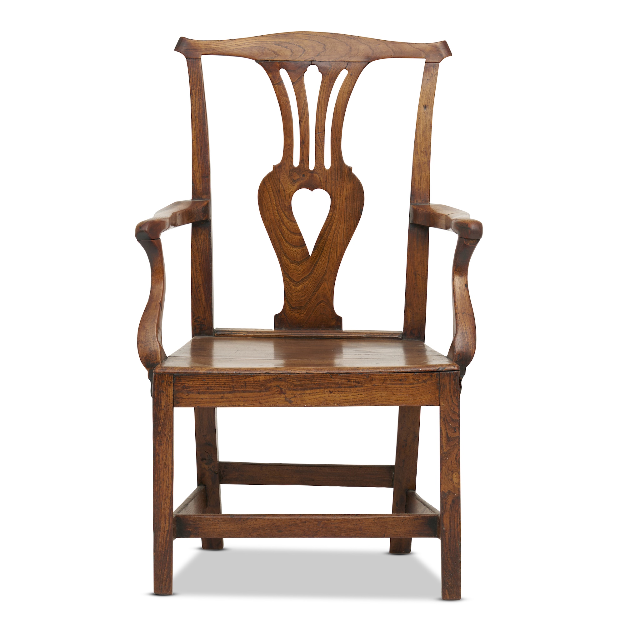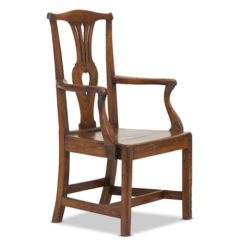 The open back with lightly shaped toprail and pierced vasiform splat above the outswept arms, on square supports joined with peripheral stretchers