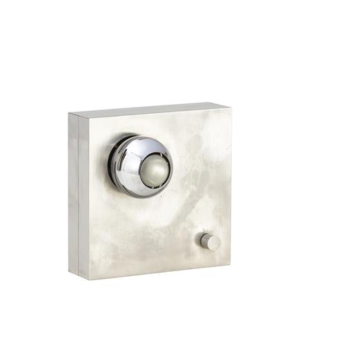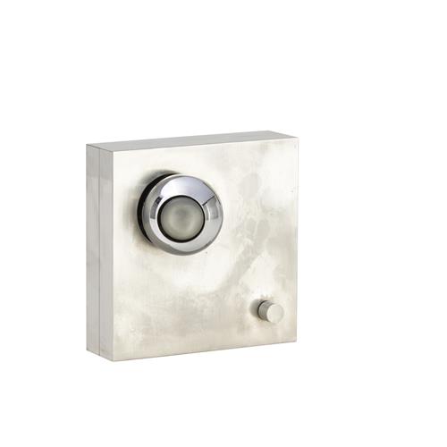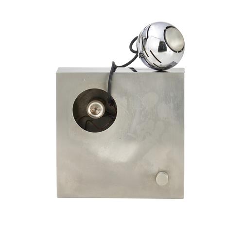 In chromed and brushed stainless steel. Square form case with spherical spot light attached to a magnet allowing range of adjustment. Manufacturer sticker affixed to underside.