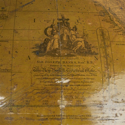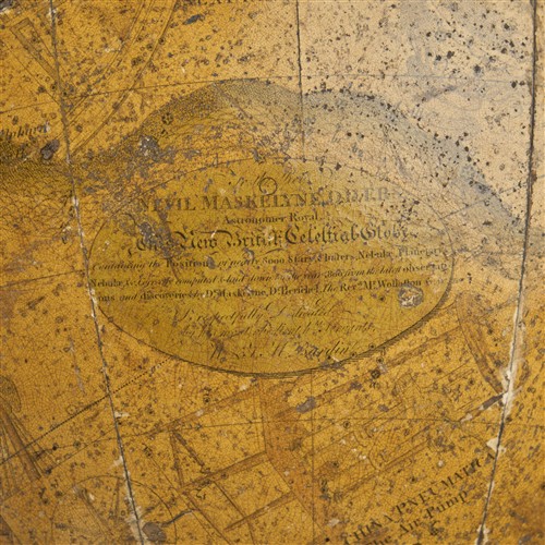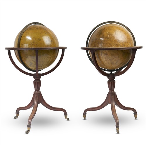 Each of hand-coloured and varnished engraved gores set within an engraved brass meridian ring mounted in a mahogany tripod stand with reeded stem on moulded supports with brass caps and casters (the feet formerly joined with stretchers with a glazed compass to the centre, now lacking), the reeded horizon ring with applied paper surface printed with compass points, astrological signs, and the names of the months; the cartouche of the terrestrial globe headed with a portrait vignette of Sir Joseph Banks and lettered 'To the Rt. Honorable / SIR JOSEPH BANKS BART. K.B. / President of the Royal Society / This New British Terrestrial Globe / Containing all the latest Discoveries and Communications, from the / most correct and Observations and Surveys, to the Year 1799 / by Captn. Cook and more recent Navigators. Engraved from / an accurate Drawing by Mr Arrowsmith, Geographer / Additions to 1807 – / — 1814 / — 1817 / Is respectfully Dedicated / by his most obedient hble. Servants / W & J.M. Bardin'; the oval cartouche of the celestial globe lettered 'To the Rev. / NEVIL MASKELYNE, D.D., F.R.S. / Astronomer Royal / This New British Terrestrial Globe / Containing the Positions of nearly 6000 Stars, Clusters, Nebulae, Planetary / Nebulae &c. Correctly computed & laid down to the year 1800, from the latest observati- / ons and discoveries by D. Maskelyne, Dr. Herschel, The Revd. Mr Wollaston &c. &c. / Is respectfully Dedicated / by his most obedient hble. Servants / W. & J.M. Bardin'