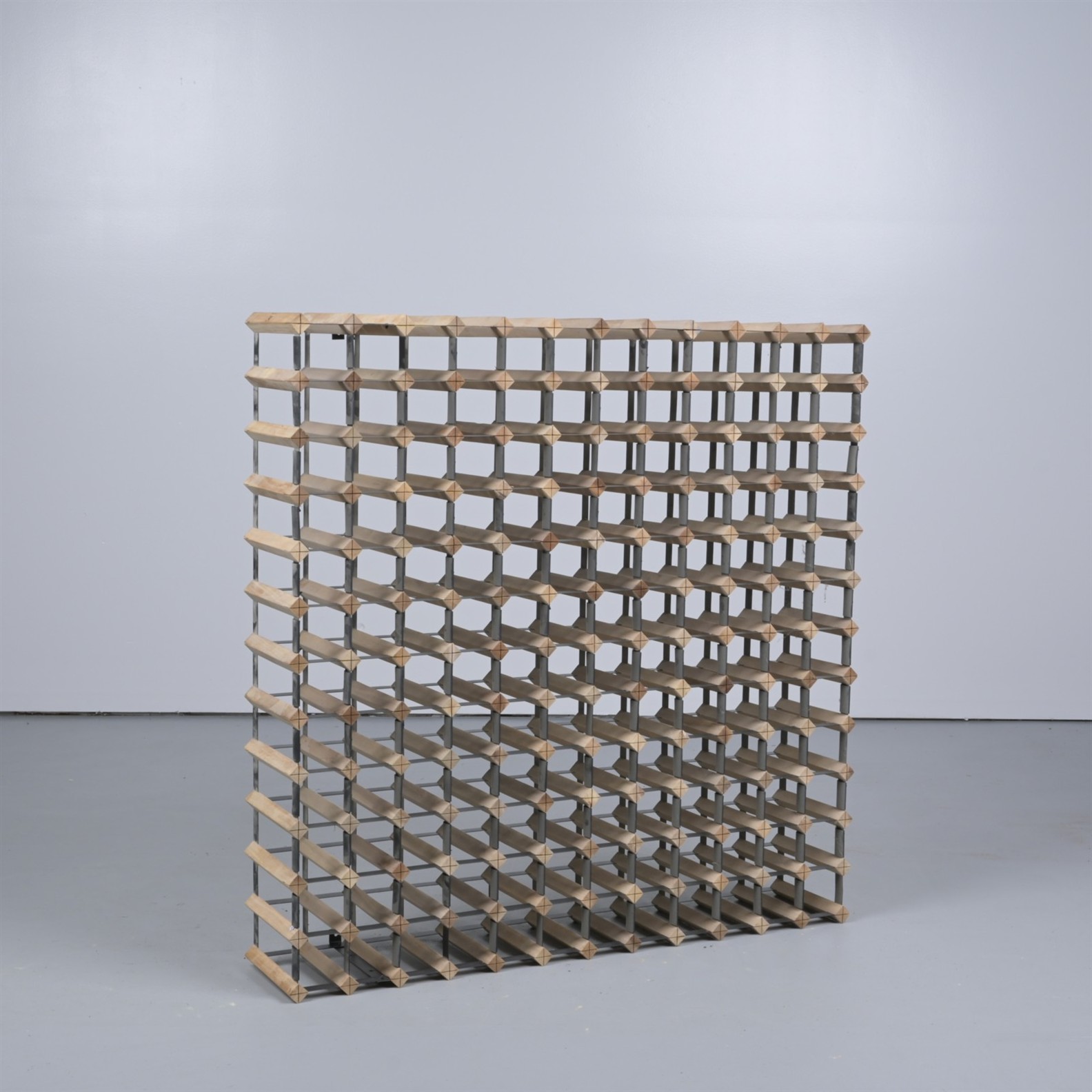 A LARGE WOODEN WINE RACK (119CM H X 118CM W X 24CM D ) (THIS ITEM MUST BE REMOVED BY PROFESSIONAL CARRIERS OR CLIENTS. LEONARD JOEL STAFF CANNOT ASSIST WITH CARRYING OR DELIVERY OF THIS ITEM)