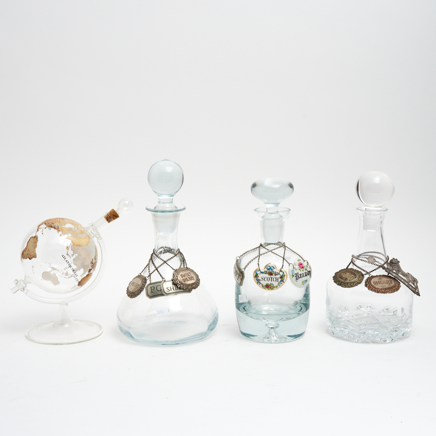FOUR DECANTERS WITH TEN LABELS INCLUDING A GLOBE-FORM DECANTER ON STAND H.28.5CM (TALLEST)