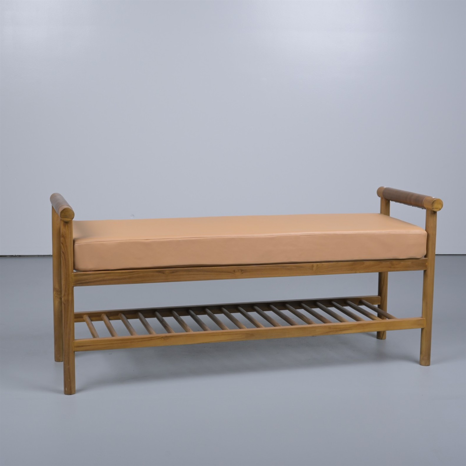 A CONTEMPORARY HARDWOOD AND LEATHER BENCH SEAT (69CM H X 150CM W X 51CM D)