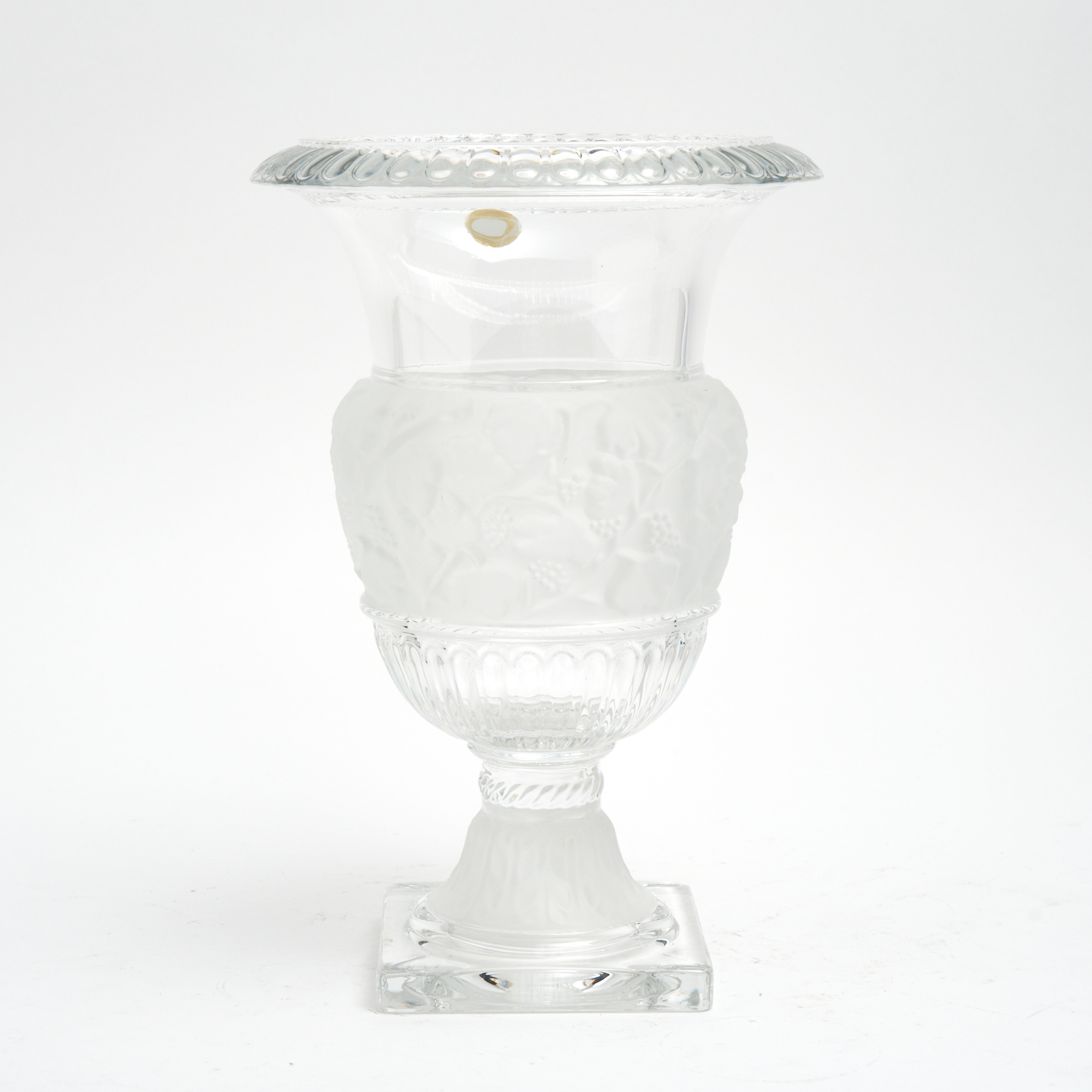 A BOHEMIA CRYSTAL CAMPAGNA URN WITH A FROSTED GRAPE VINE MOTIF H.31CM
