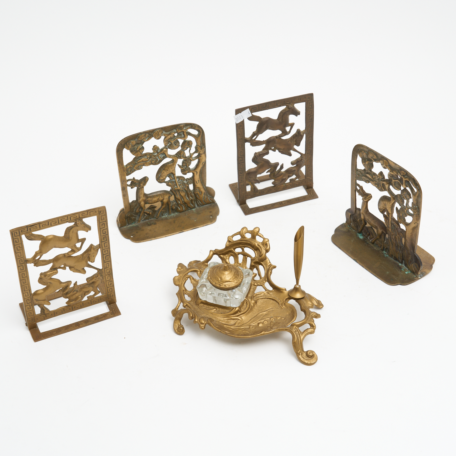 TWO PAIRS OF BRASS BOOKENDS (ONE CALLAPSIBLE) TOGETHER WITH A GILDED BRASS INKWELL H.16CM