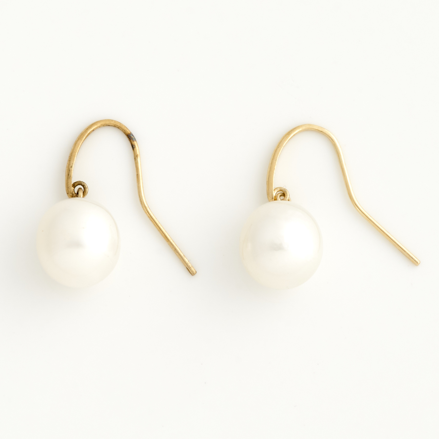 A PAIR OF SOUTH SEA PEARL EARRINGS IN 9CT GOLD, THE PEARL MEASURING 11.5MM, TO SHEPHERD HOOK FITTINGS, 5.51GMS