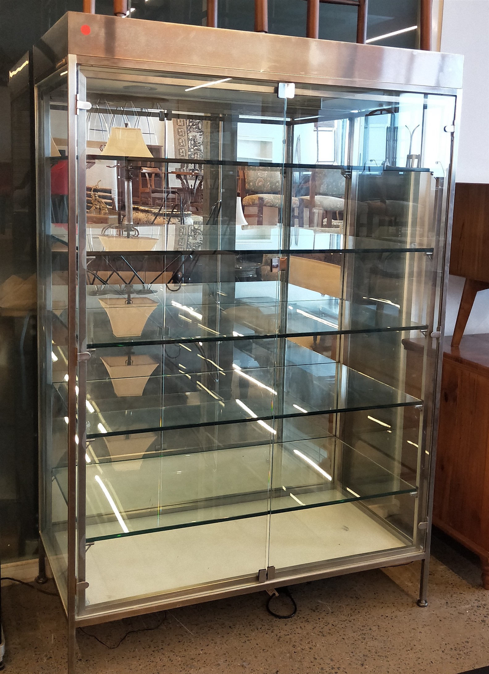 A STAINLESS STEEL AND GLASS DISPLAY CABINET (181CM H X 120CM W X 60CM D) (THIS ITEM MUST BE REMOVED BY PROFESSIONAL CARRIERS OR CLIENTS. LEONARD JOEL STAFF CANNOT ASSIST WITH CARRYING OR DELIVERY OF THIS ITEM)