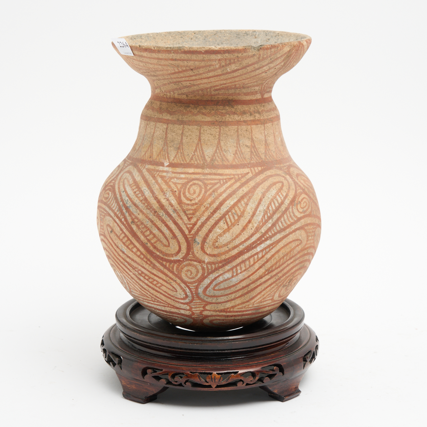 A THAI POTTERY JAR ON WOODEN STAND IN THE NEOLITHIC STYLE H.31.5CM