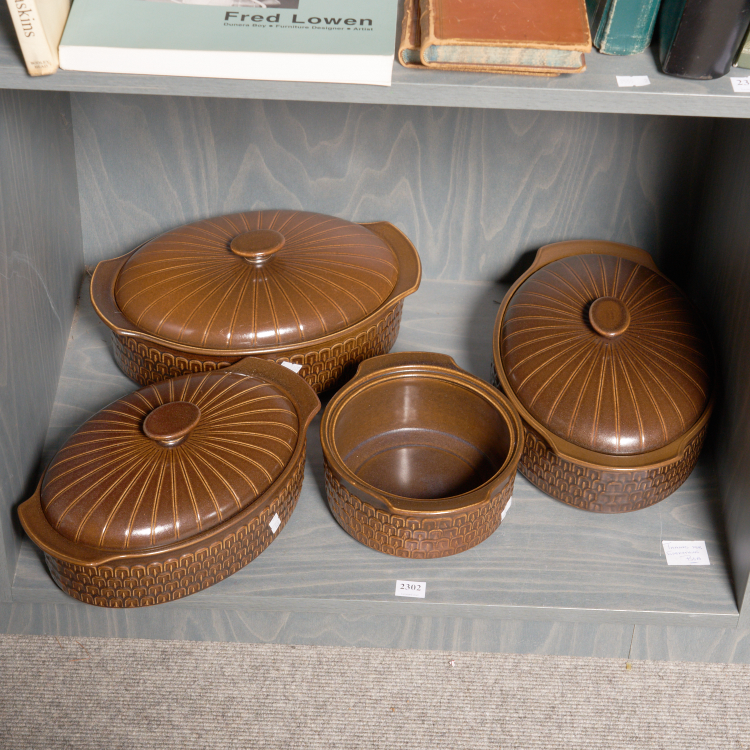 THREE WEDGWOOD PENNINE EARTHENWARE CASSEROLES PLUS ONE EXTRA L.31CM (LARGEST)