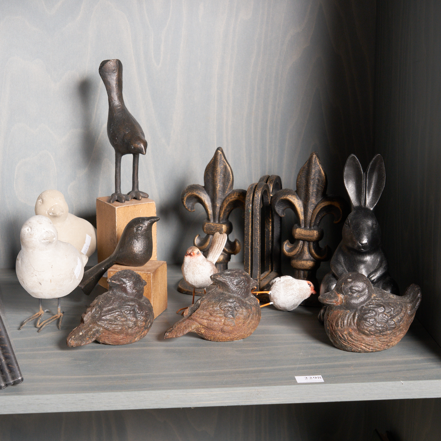 A COLLECITON OF ORNAMENTS INCLUDING VARIOUS CAST IRON AND CERAMIC BIRDS, TOGETHER WITH A PAIR OF FRENCH CAST IRON BOOKENDS H.26.5CM (TALLEST)