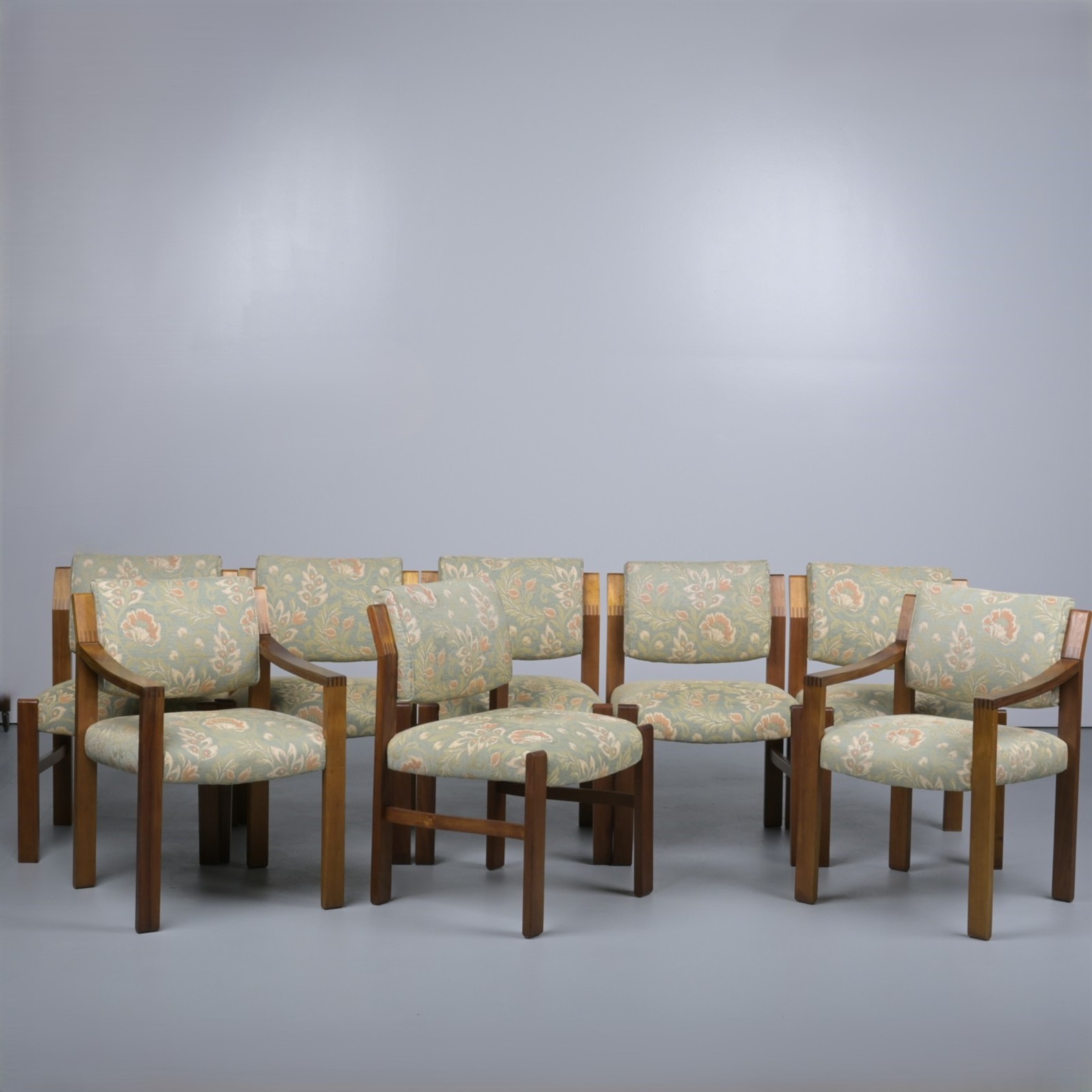 A SET OF EIGHT UPHOLSTERED DINING CHAIRS (87CM H X 60CM W X 54CM D) (THIS ITEM MUST BE REMOVED BY PROFESSIONAL CARRIERS OR CLIENTS. LEONARD JOEL STAFF CANNOT ASSIST WITH CARRYING OR DELIVERY OF THIS ITEM)