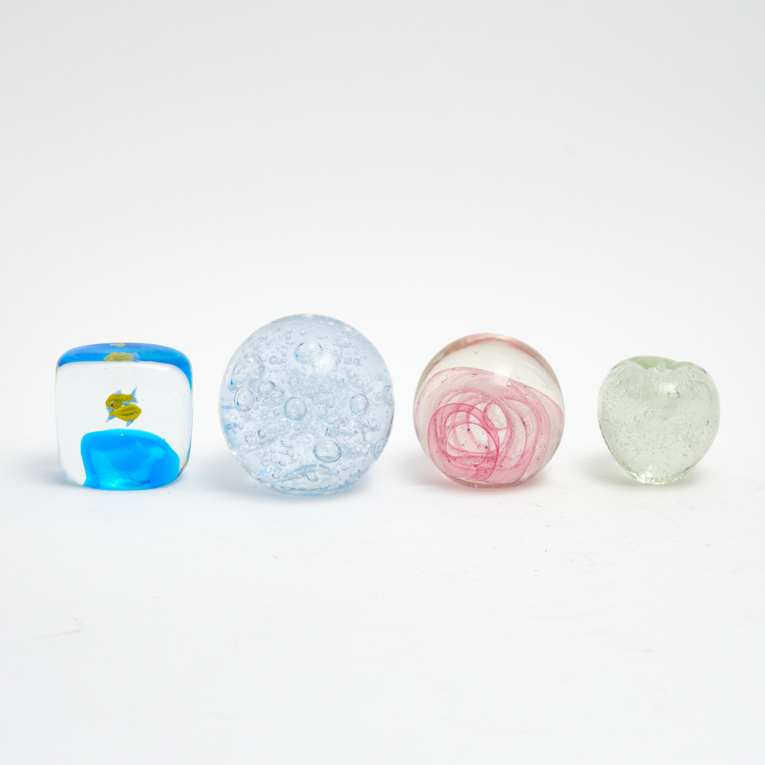 FOUR ART GLASS PAPER WEIGHTS INCLUDING AN AQUARIUM THEMED PAPER WEIGHT H.9.5CM (LARGEST)