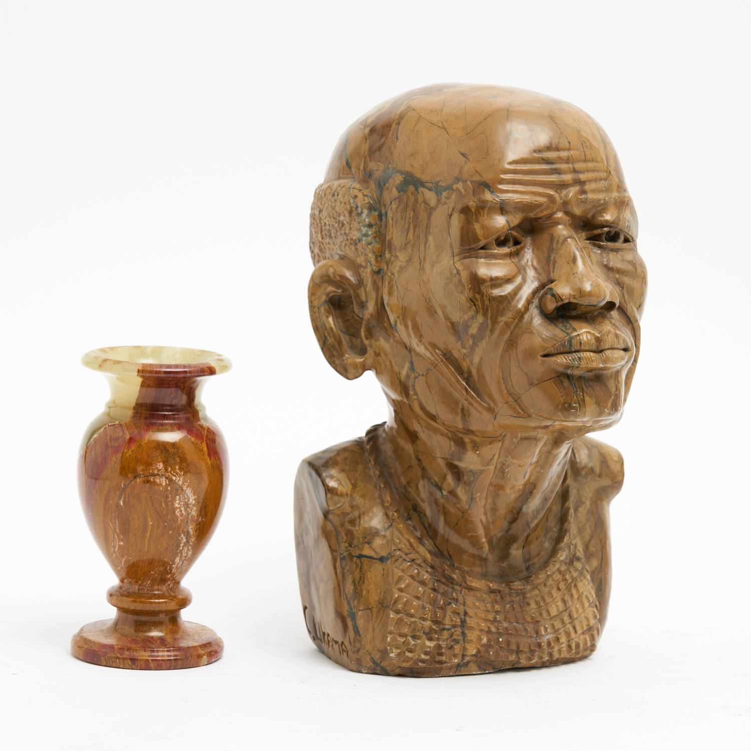 A ZIMBABWE CARVED STONE BUST OF A MAN, SIGNED C. UKAMA, TOGETHER WITH A SMALL GREEN STONE URN H.28.5CM