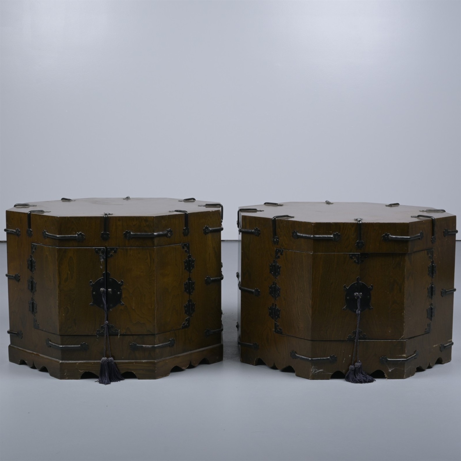 A PAIR OF LARGE KOREAN ELM OCTAGONAL BOXES (A/F) (52H X 72W X 72D CM) (THIS ITEM MUST BE REMOVED BY PROFESSIONAL CARRIERS OR CLIENTS. LEONARD JOEL STAFF CANNOT ASSIST WITH CARRYING OR DELIVERY OF THIS ITEM)