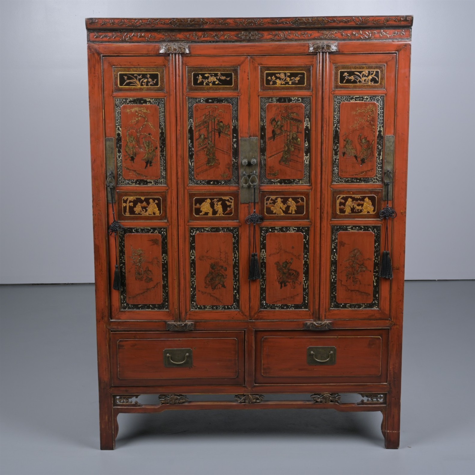 A CHINESE RED LACQUERED CABINET (A/F) (173H X 123W X 59D CM)