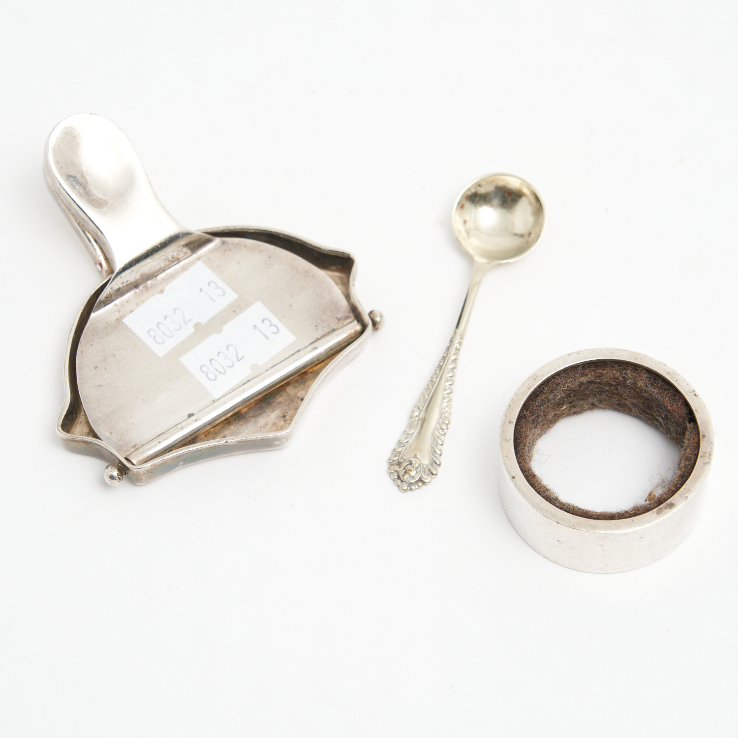 THREE PIECES OF STERLING SILVER INCLUDING A LEMON SQUEEZER, NAPKIN RING/DRIP STOPPER, AND SALT SPOON 138G (TOTAL) L.7CM (LARGEST)