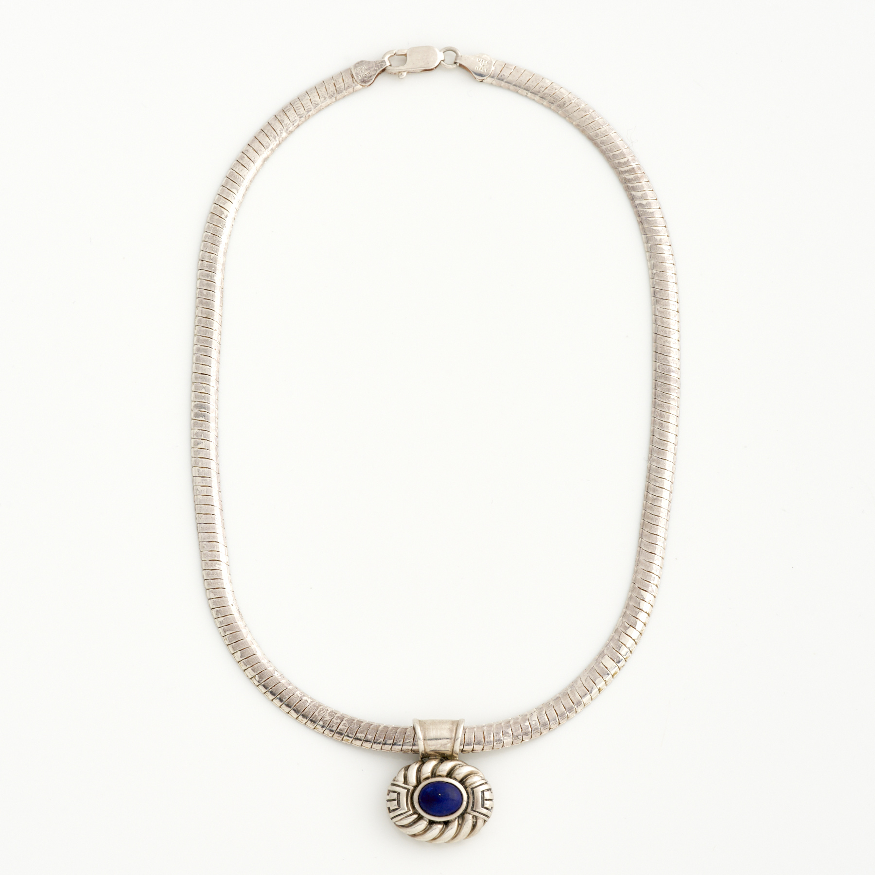 A LAPIS LAZULI PENDANT IN STERLING SILVER, 20MM, TO AN OMEGA CHAIN IN STERLING SILVER, 400MM