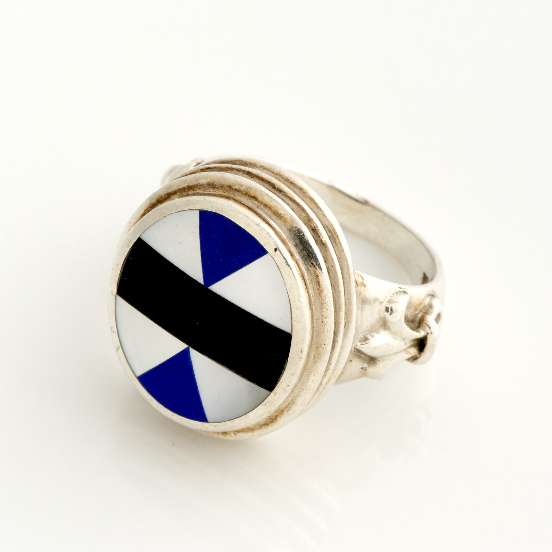 AN ENAMEL AND MOTHER OF PEARL RING IN STERLING SILVER, SIZE L