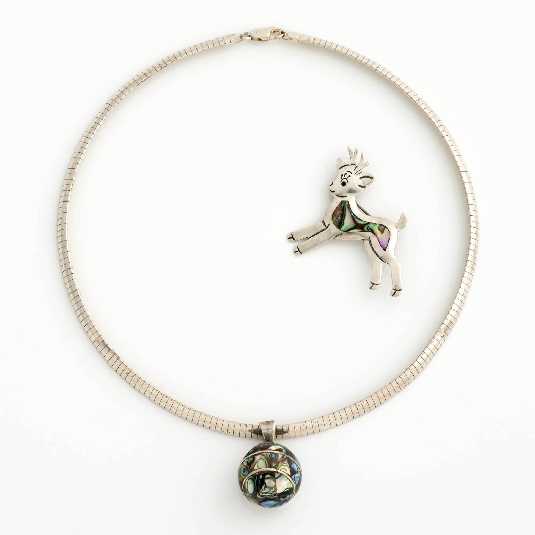 A PAUA SHELL SUITE IN STERLING SILVER, COMPRISING A PENDANT, 21.6MM, TO AN OMEGA CHAIN, 460MM, AND A BROOCH, 50MM