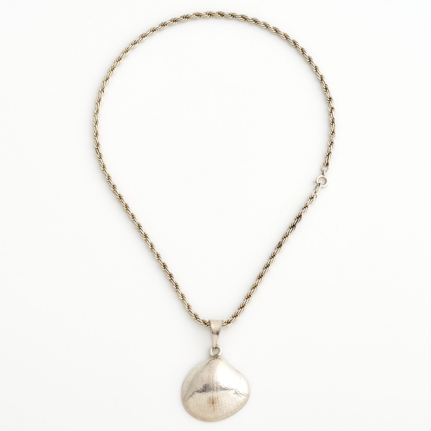 A SHELL MOTIF PENDANT IN STERLING SILVER, TO A ROPE CHAIN IN STERLING SILVER, 440MM