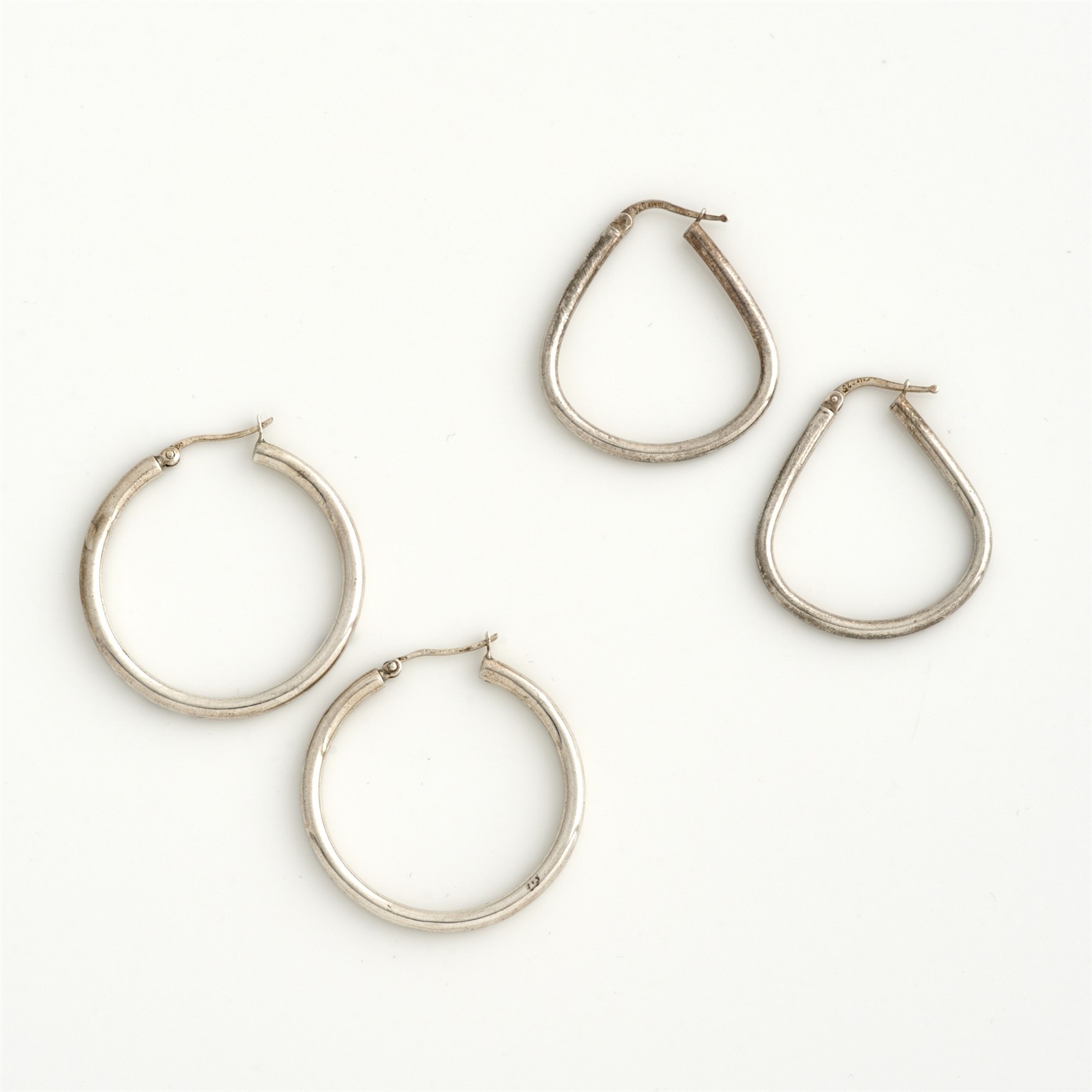 TWO PAIRS OF HOOP EARRINGS IN STERLING SILVER TO POST AND CLIP FITTINGS, THE LARGEST PAIR MEASURING 35MM X 38MM