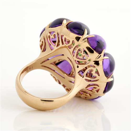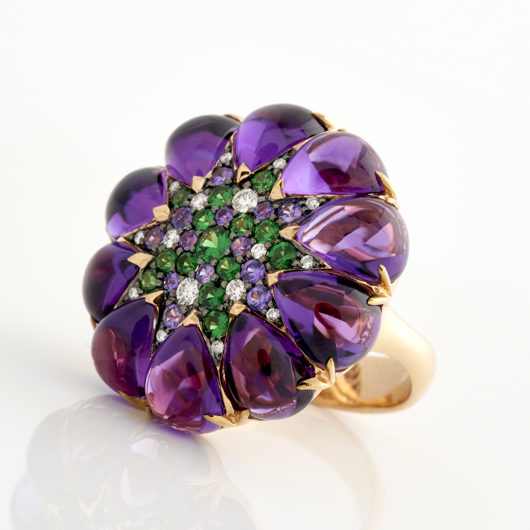 AN AMETHYST, TSAVORITE GARNET, SAPPHIRE AND DIAMOND RING IN 18CT GOLD, THE AMETHYSTS TOTALLING 23.68CTS, THE TSAVORITE GARNETS TOTALLING 0.96CTS, THE SAPPHIRES TOTALLING 0.59CTS, THE DIAMONDS TOTALLING 0.31CTS, FINGER SIZE O, 21.13GMS, ACCOMPANIED BY A VALUATION