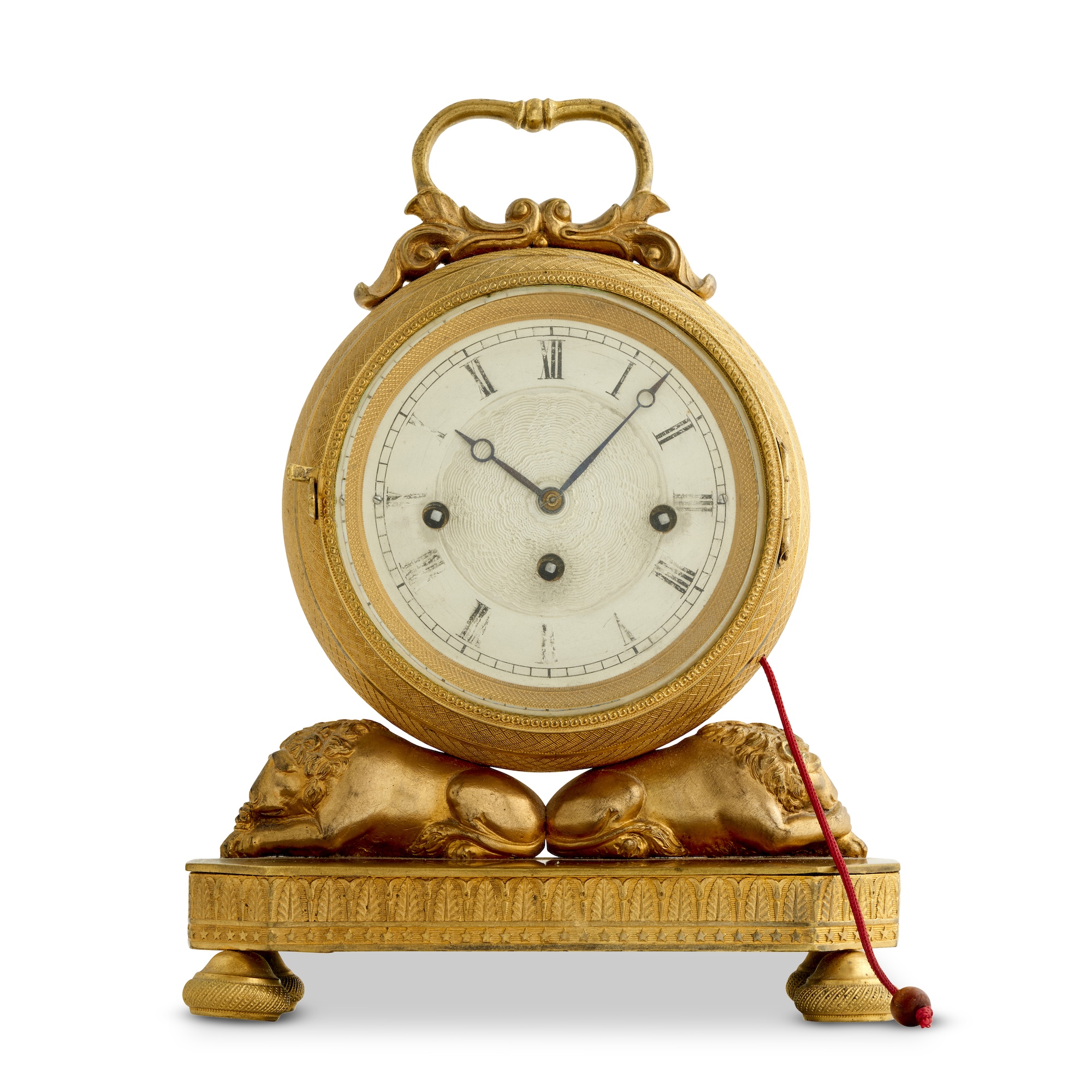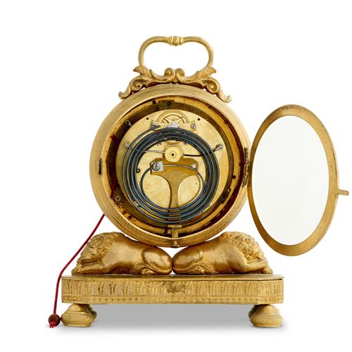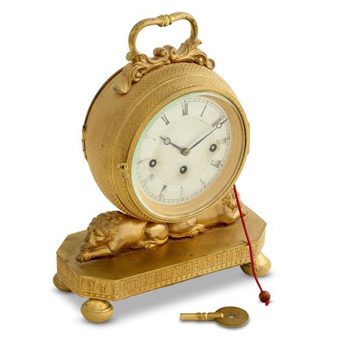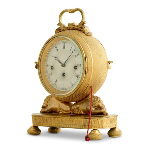The two-day movement with balance wheel lever escapement and pull repeat quarter striking on two gongs, the silvered and engine-turned Roman numeral dial with glazed bezel set in a drum case raised on a pair of of recumbent lion figures on a foliate platform base with four bun feet