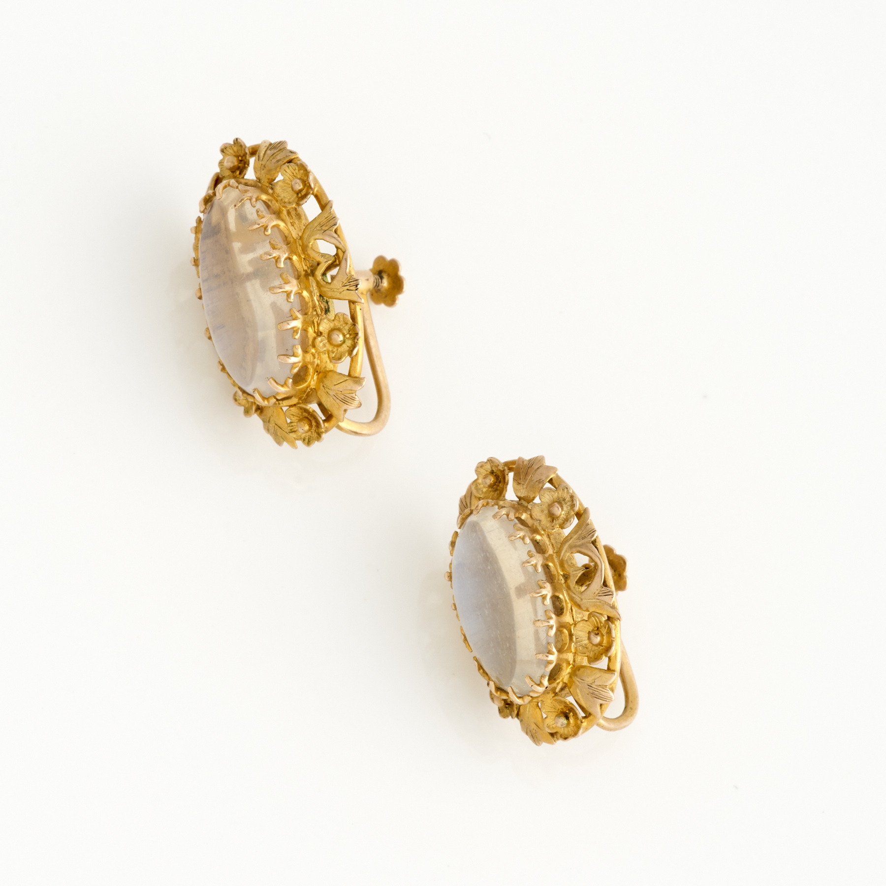 A PAIR OF MOONSTONE EARRINGS IN 9CT GOLD, TO SCREWBACK FITTINGS, 25MM X 20MM, 9.8GMS