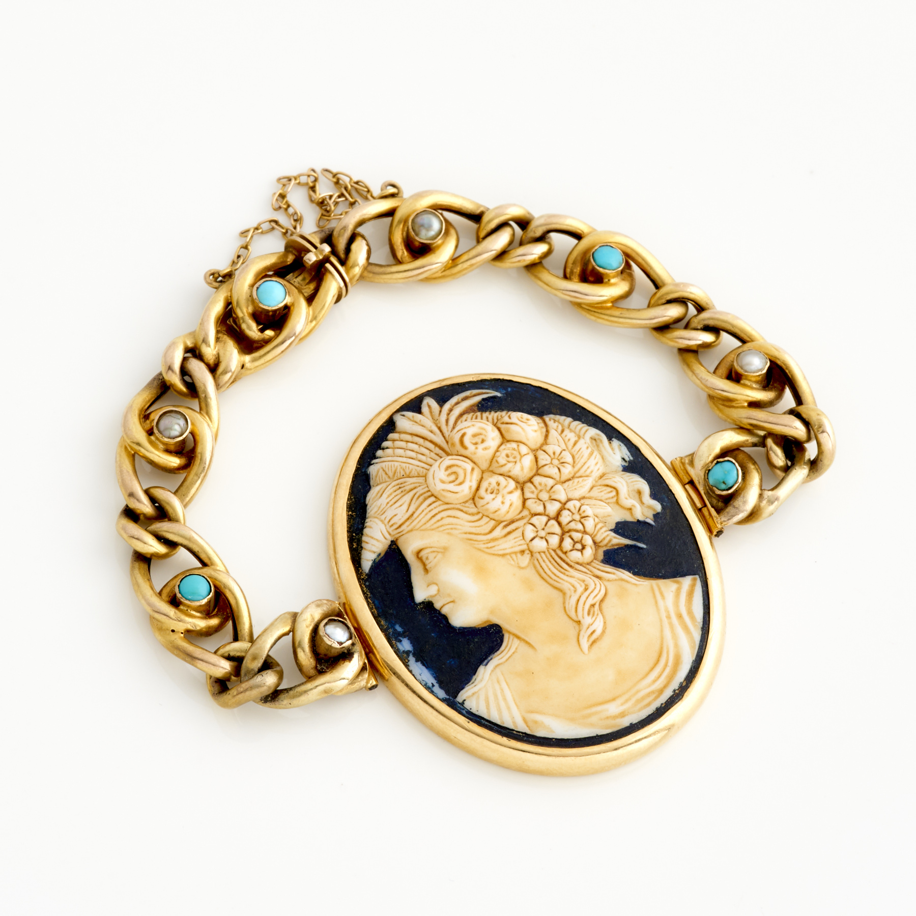 A CAMEO BRACELET IN 9CT GOLD WITH TURQUOISE AND SEED PEARL DETAIL, INNER DIAMETER 45MM, TOTAL WEIGHT 27.5GMS
