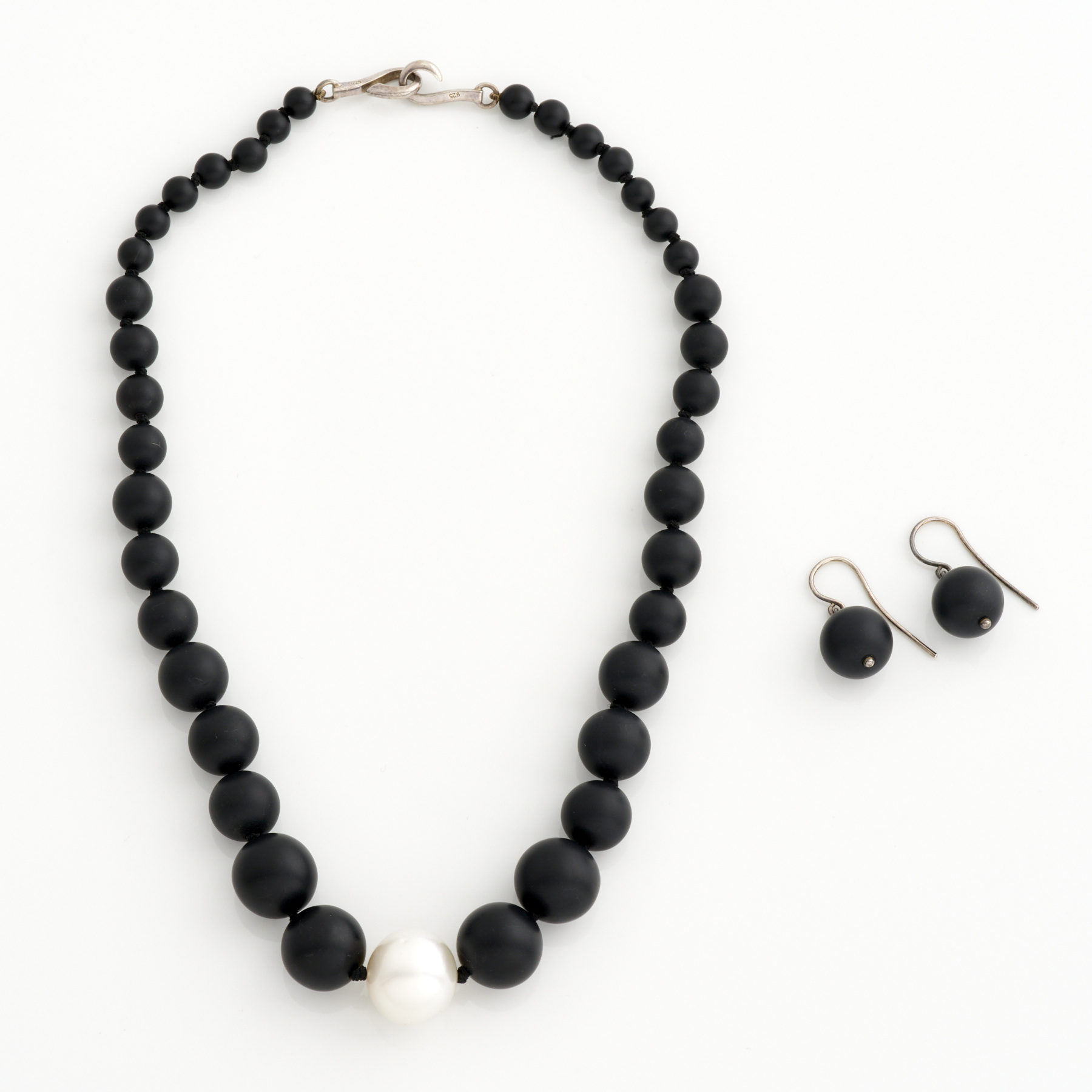JAN LOGAN, A SUITE OF JET AND PEARL JEWELLERY INCLUDING A NECKLACE, 400MM, AND A PAIR OF EARRINGS, 25MM, TO SHEPHERD HOOK FITTINGS, 5.95GMS, ACCOMPANIED BY A POUCH