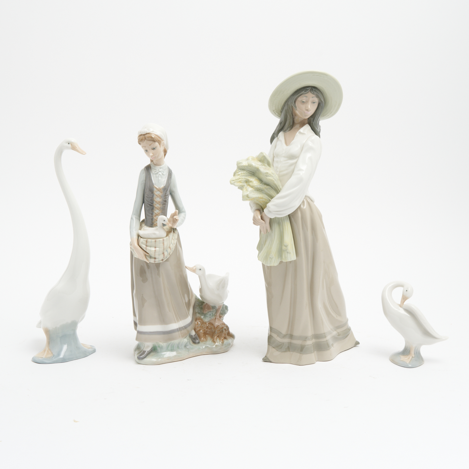 A GROUP OF NAO FIGURINES INCLUDING GIRL WITH WHEAT, GIRL WITH GEESE, AND TWO OTHER GEESE FIGURINES H.37CM (TALLEST)