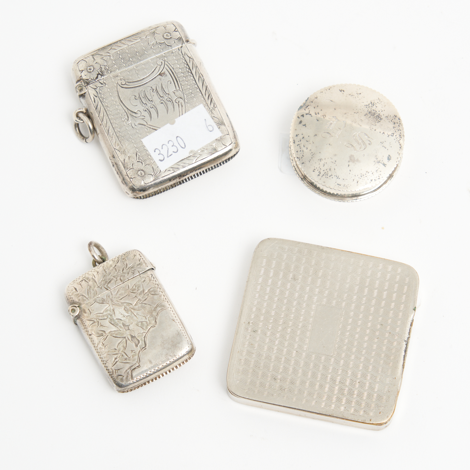 TWO STERLING SILVER DECORATIVELY ENGRAVED VESTA CASES, TOGETHER WITH A PILL BOX AND A SILVER PLATE DISPENSER 64G H.4.8CM (LARGEST)