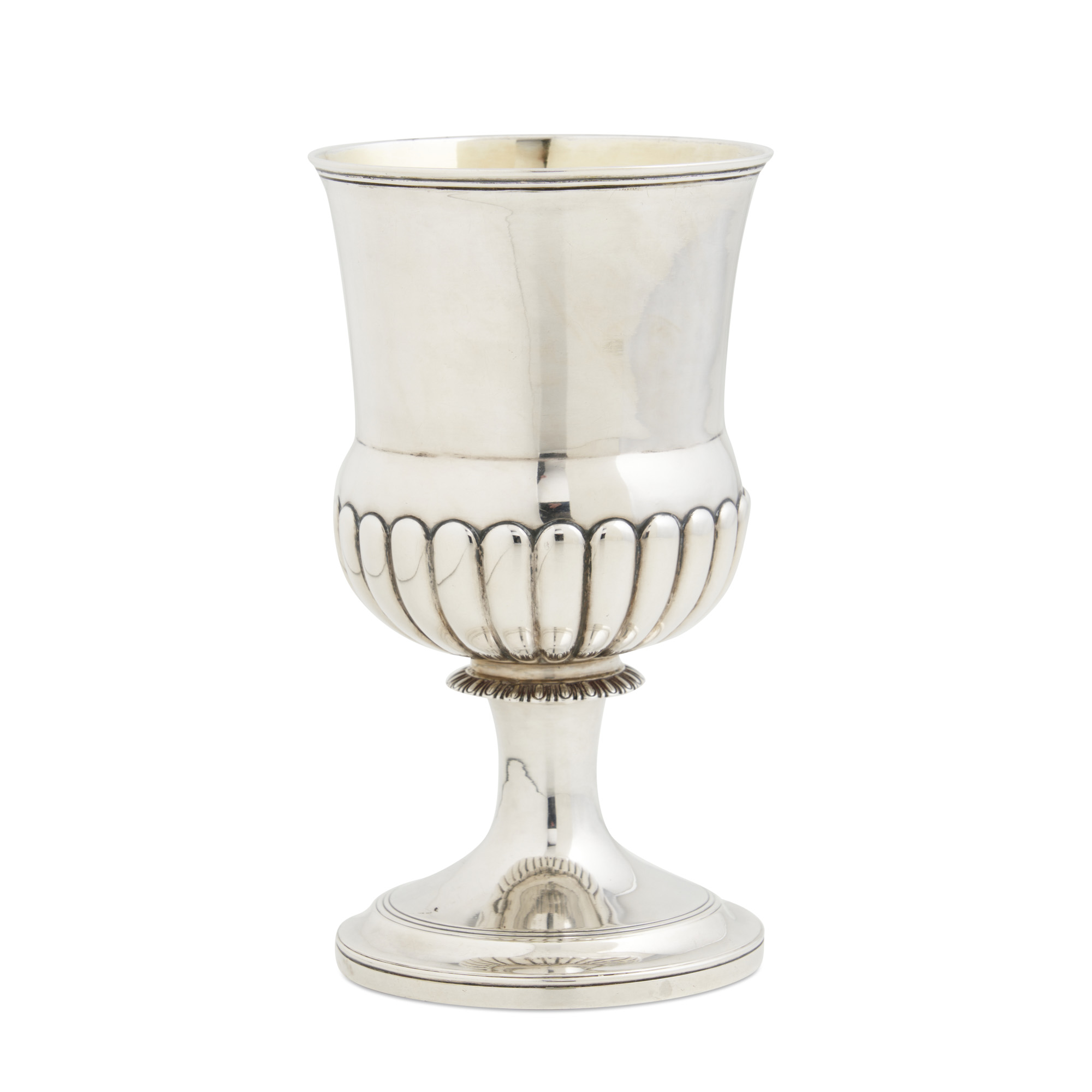 The body gadrooned to its swelling lower part on a stem with gadrooned blade knop and moulded circular foot
